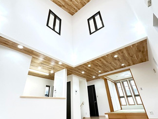 事例1)LDKと吹き抜けの天井部分は、木目調のクロス(サンゲツのTH32671)を使用。